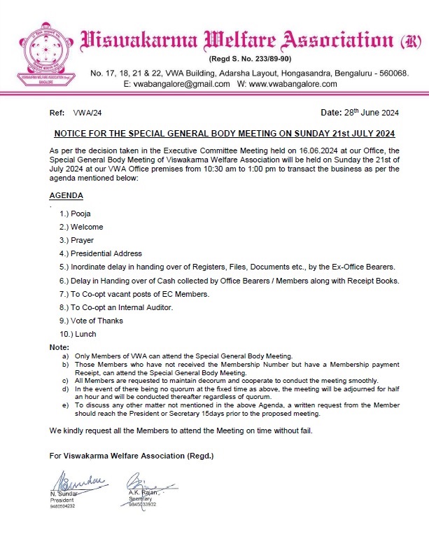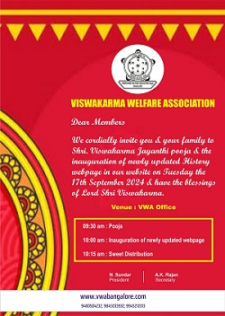The Annual General Body Meeting of Viswakarma Welfare Association for 2025 will be held on Sunday, the 29th June 2025 @ 10:30 A.M at VWA Office premises, Bangalore. Please find the Invitation for the meeting below.