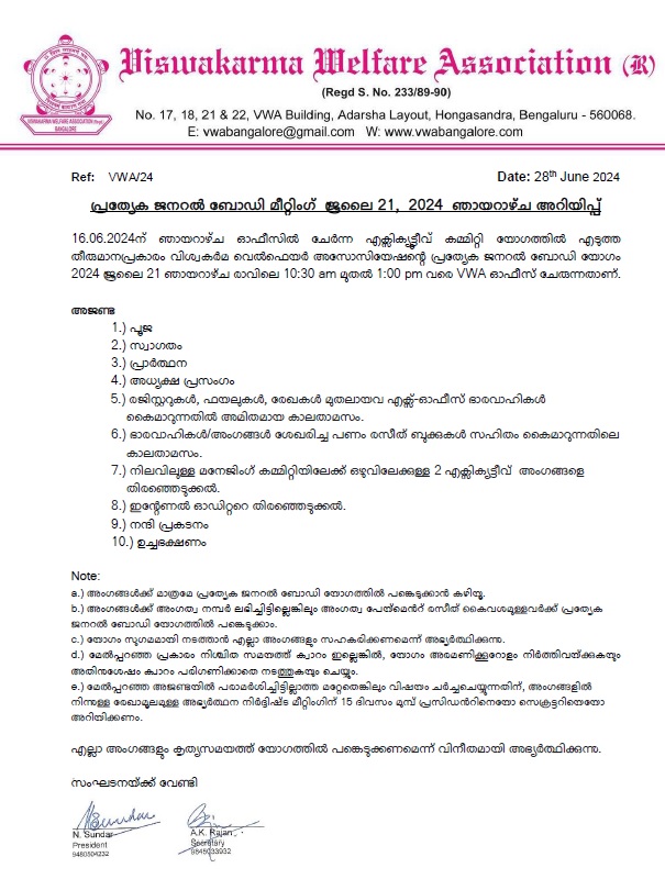 A Special General Body Meeting of the Viswakarma Welfare Association was conducted on Sunday the 21st of July 2024 at our VWA Office premises. Please find the report of the meeting below.