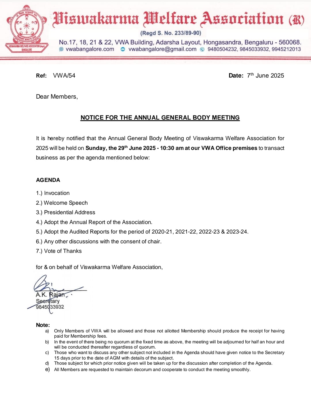 The Annual General Body Meeting of Viswakarma Welfare Association for 2025 will be held on Sunday, the 29th June 2025 @ 10:30 A.M at VWA Office premises, Bangalore.