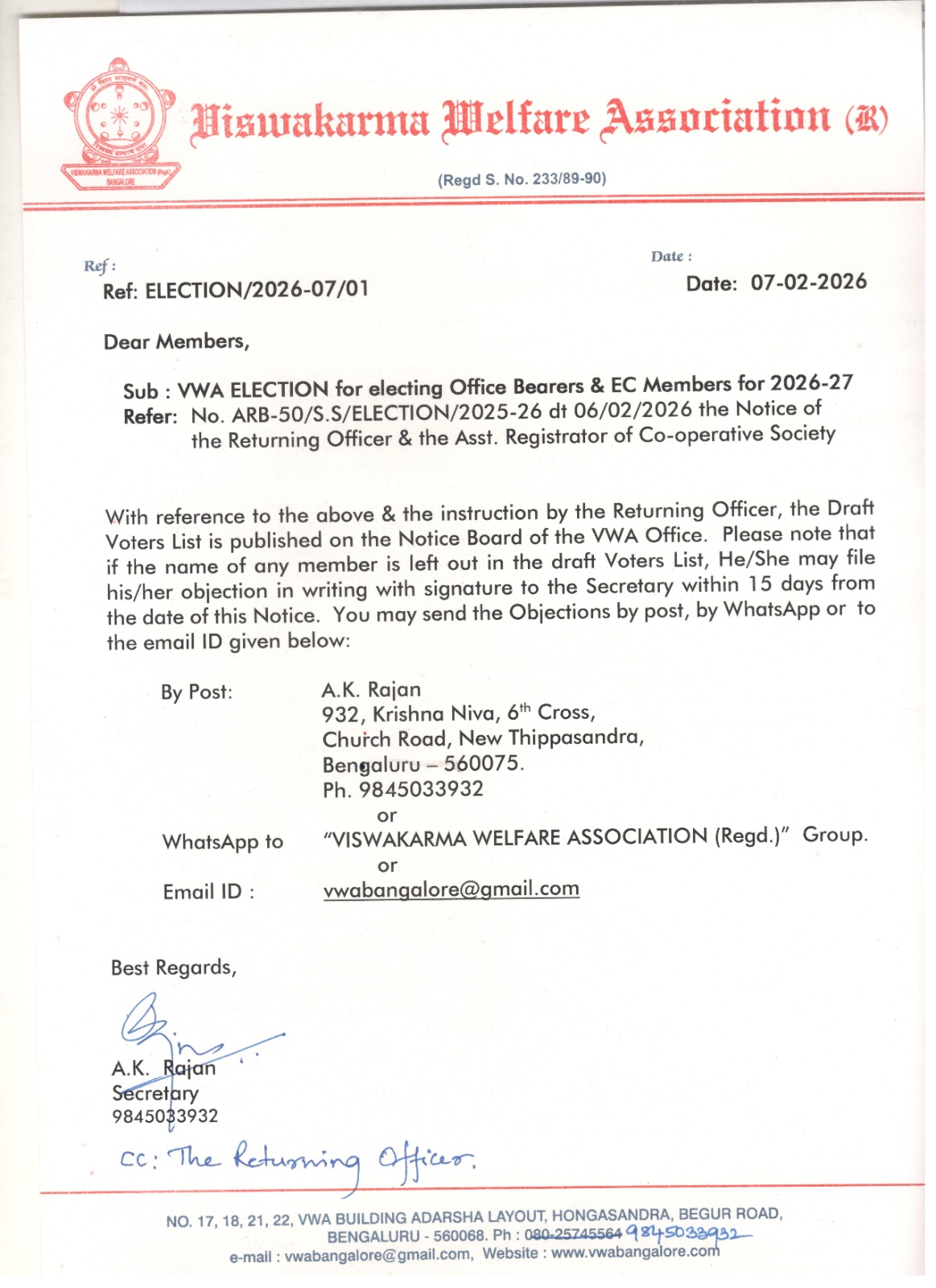 The Annual General Body Meeting of Viswakarma Welfare Association for 2025 will be held on Sunday, the 29th June 2025 @ 10:30 A.M at VWA Office premises, Bangalore. Please find the Invitation for the meeting below.